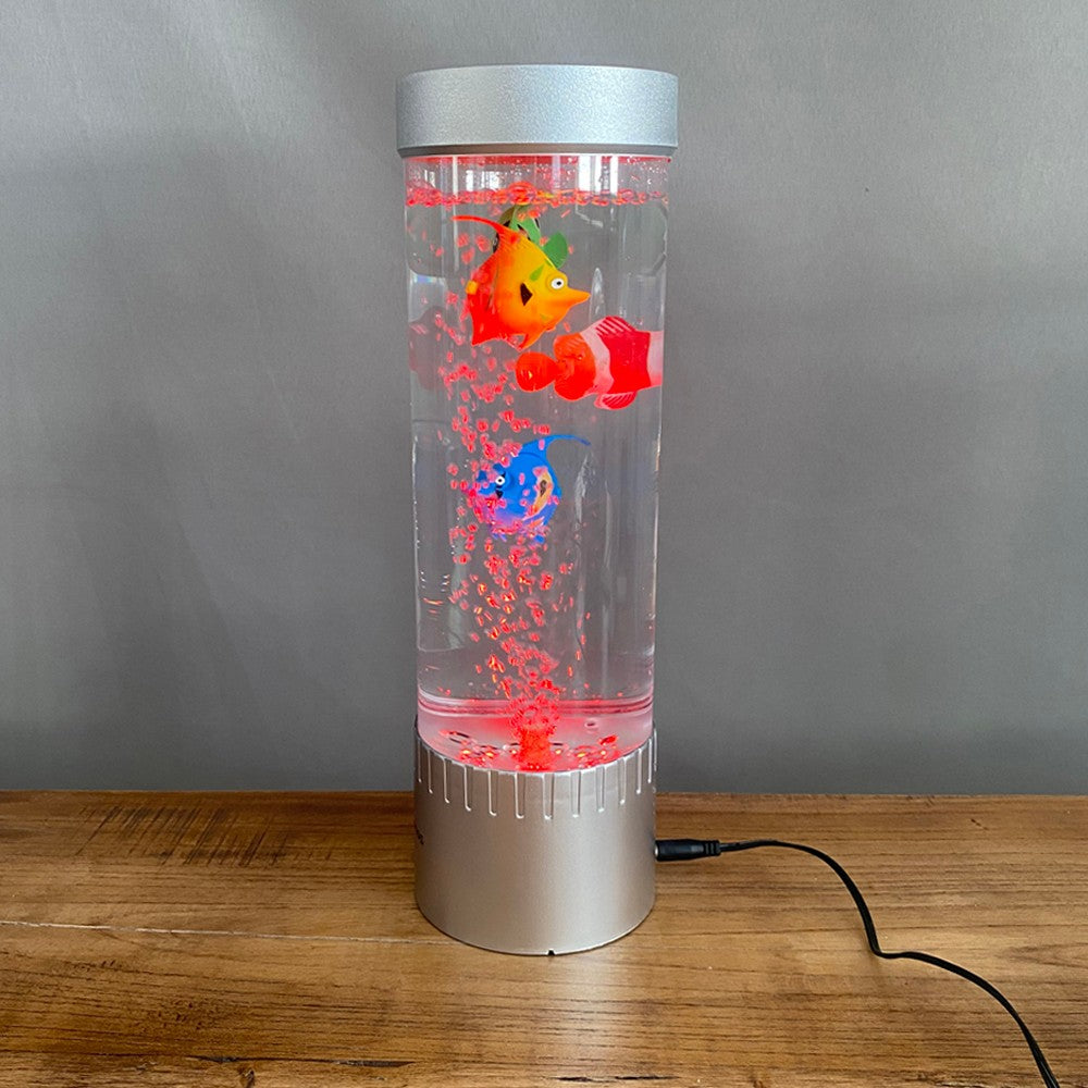 there are three colors of 12PCS LED,(RED,BLUE,GREEN),and can alternately color deterioration ,LED illuminated bubbling water lamps feature bright, multi-colored LED lights that continually rotate and change colors. Our LED lights are rated for 50,000 hours.usually,we put Jellyfish inside . Jellyfish can swimming like real fish,These lighted water lamps are lots of fun, and the included plastic tropic.